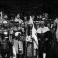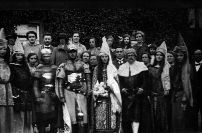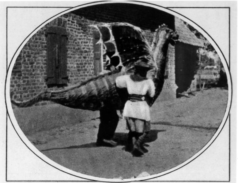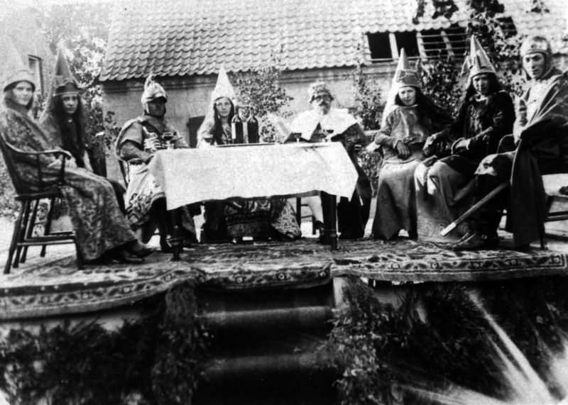 Dit is het draaksteek gezelschap van Beeselgeeft een voorstelling in het Openluchtmuseum in Arnhem ter ere van "Het Vaderlandsch Historisch Volksfeest' dat op 3 tot en met 5 september 1919 werd gehouden, mede ter promotie van de ingebruikneming van het Openluchttheater en Openluchtmuseum, welke in de winter van 1918 op 1919 werden gebouwd. Op de achtergrond de standaardmolen van Huizen , die er overigens nog steeds staat. |
