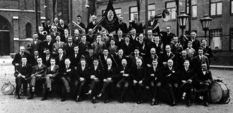 Foto gemaakt t.g.v. het 75-jarig bestaan van harmonie St. Cecilia in Swalmen in juli 1927. In de eerste rij zittend met dirigeerstok de heer Paul Guillaume die van verscheidene der beste Limburgse muziekkorpsen directeur was. |