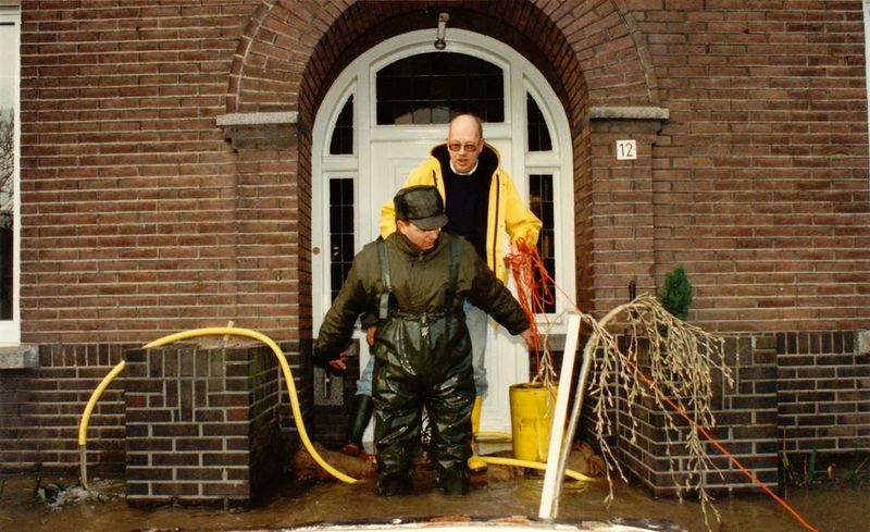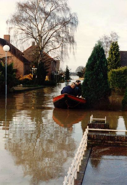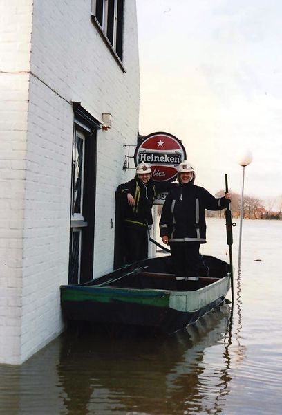 Overstroming van de Maas in 1993 ter hoogte van de Maasstraat in Belfeld. De vrijwillige brandweer Belfeld is bezig met de evacuatie van bewoners. |