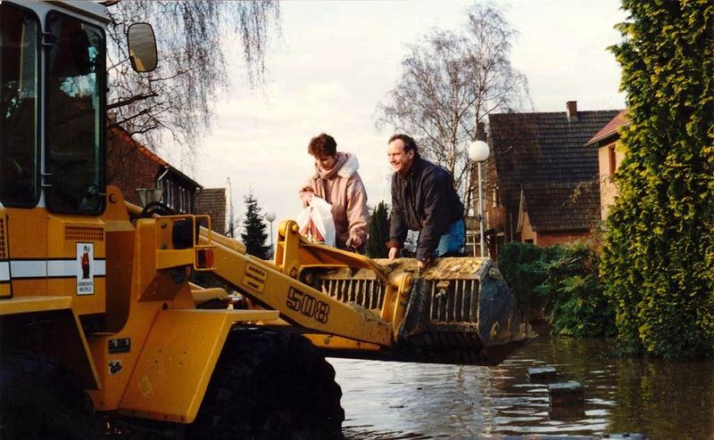 Evacuatie van de familie Hoezen tijdens het hoog water van de Maas in 1993 op de Maasstraat in Belfeld. |
