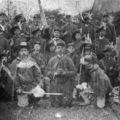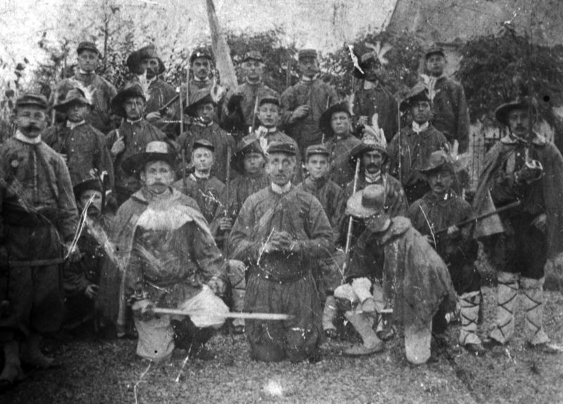 We zien hier een groep toneelspelers. Men zou het ook een tableau vivant kunnen noemen. In het middelpunt knielt een zouaaf, een strijder voor de paus. Tussen 1865 en 1870 trokken zo‘n 3000 Nederlanders naar Italië om daar de Pauselijke Staat, die toen Noord-Italië van Zuid-Italië scheidde, en daarmee de paus te beschermen tegen de Garibaldisten. Deze laatsten stonden onder leiding van Guiseppe Garibaldi en hadden tot doel de eenheid van Italië te herstellen. We zien hier dus Garibaldisten, he Meer ... |