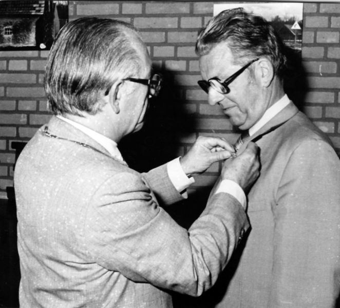 Fabrieken / Bedrijven | Burgemeester J.T.Hendrix speldt Jac. Laumans een onderscheiding op. | Keulseweg 86 | Reuver | |||||