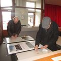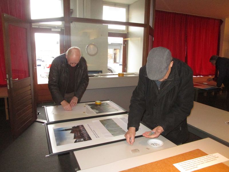Ter gelegenheid van het feit dat het Philharmonisch gezelschap in 2020 150 jaar bestaat heeft de werkgroep bijzonder activiteiten van de Heemkundevereniging Maas en Swalmdal, in samenwerking met de Harmonie, een etalage ingericht in het oude gebouw van de apotheek waarin ze beelden laten zien over het verleden van de Harmonie. Op de foto zien we enkele leden bezig met het samenstellen van de borden. |