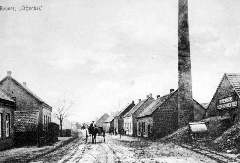 Reuver Offenbeek de Keulseweg omstreeks 1918 Rechts stoomdakpannenfabriek van H.Trienekens later Feyen en nu bejaardenwoningen. Links café Teunissen in 1989 afgebroken. Op de achtergrond kinderen café Heinke Killaars Op de kar Naed Teunissen |