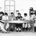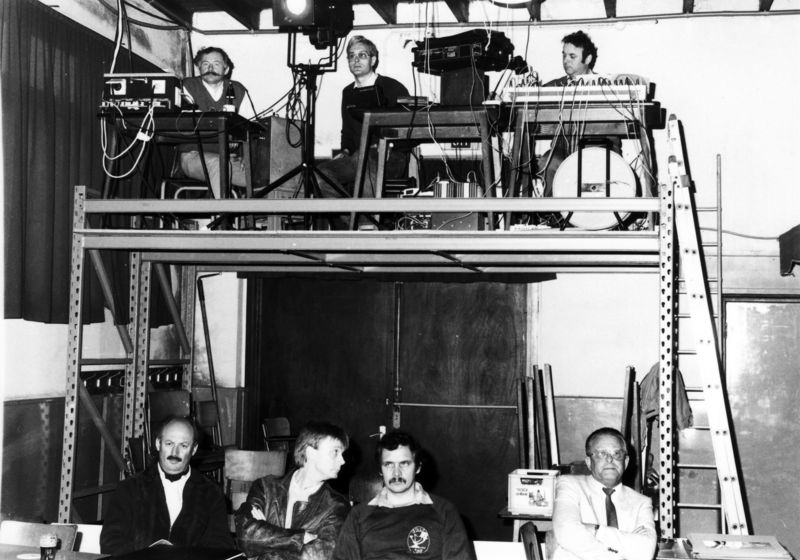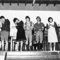 Oefenen voor toneelstuk bij de Koupman. Geluid en belichting boven van links naar rechts: Boy Dohmen - De Wit - NN Regie zittend : NN - NN - NN - Sjra Vincent |
