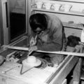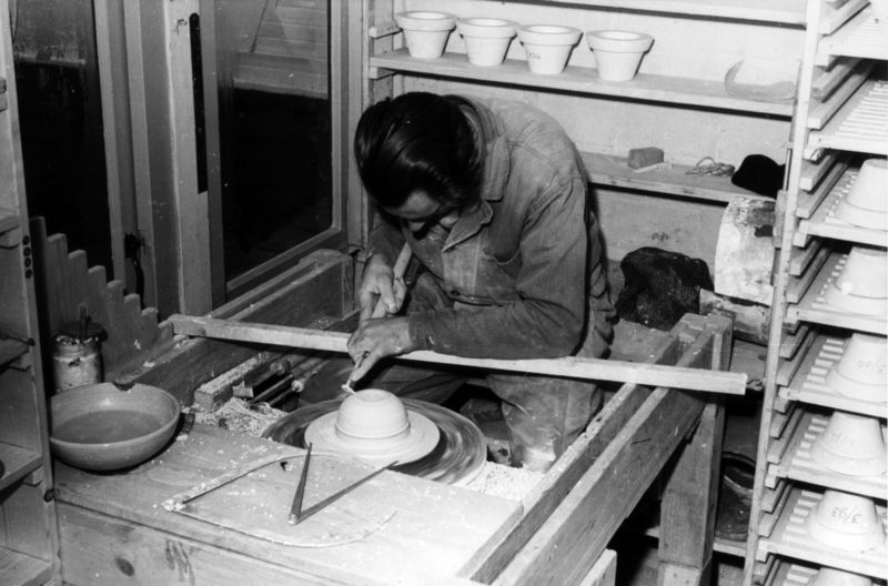 Draaiwerk door Alex Nelissen bij De Steenbok. Alex Nelissen is hier op 21-11-1949 bezig met het draaien van een bloembakje. Het bedrijf startte in 1957 met de productie van vloertegels. De heer Nick Wesselmans was destijds de eigenaar van het bedrijf.De Steenbok produceerde aanvankelijk alleen bloemisterij aardewerk. Eerst in 1971 werd volledig overgegaan op het fabriceren van verglaasde tegels, voor die tijd maakte men aardewerk voor de bloemisterij en na 1964 lilliputsteentjes. In 1994 gin Meer ... |