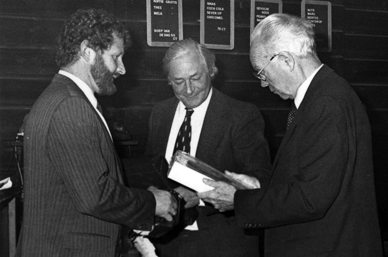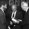Fabrieken / Bedrijven | Cees den Dulk (links) welke zojuist in naam van zijn bedrijf de export-scepter heeft ontvangen, overhandigd N.E.C.-voorzitter Fokkema een fraai keramisch bord. In het midden K.v.K.-secretaris Frans v.d. Voort. | Reuver | ||||||