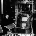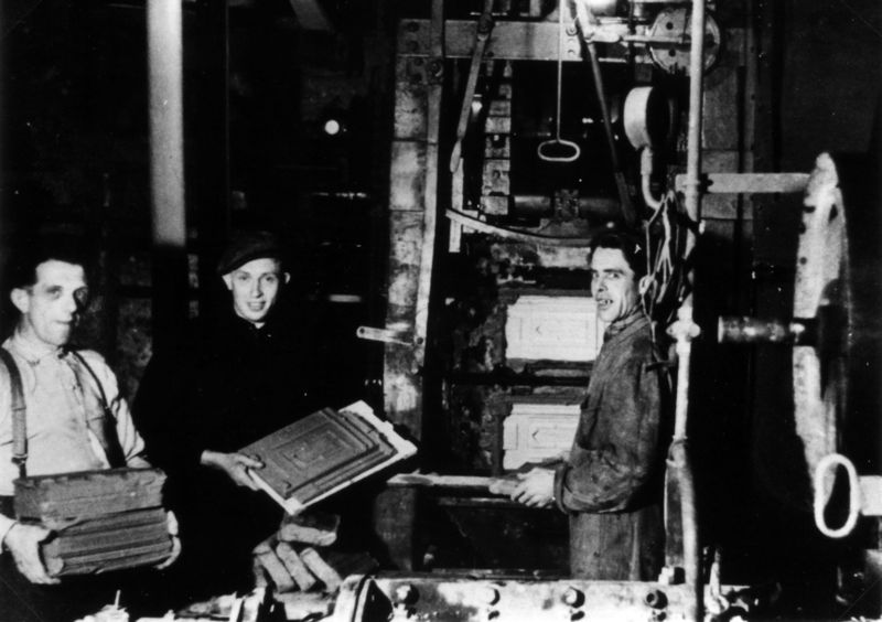 Een pannenpers bij Laumans. Giel Lemmen staat klaar met de kleikoeken. Rechts Graad Geerlings, die de kleikoeken op de pers legde (andere kant). In het midden Wiel Dorssers, die de pannen afnam. |
