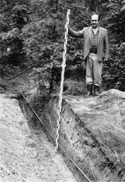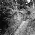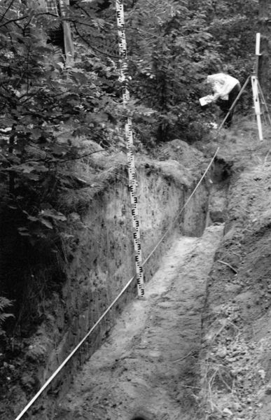 Archeologie | Profiel landweer de Wolfsgraaf. Op de achtergrond Jan Slabbers, tekenaar. | Groenewoud | Swalmen | 1984 | ||||