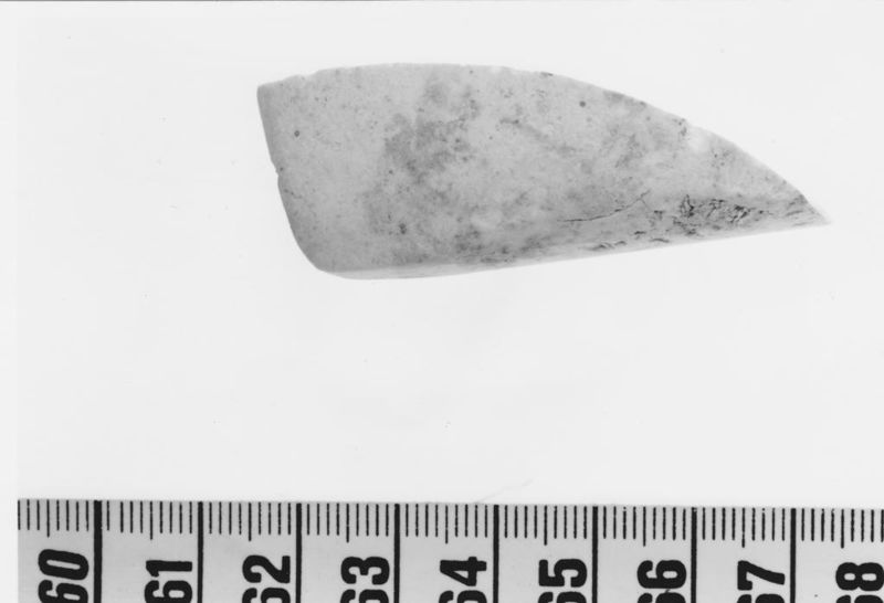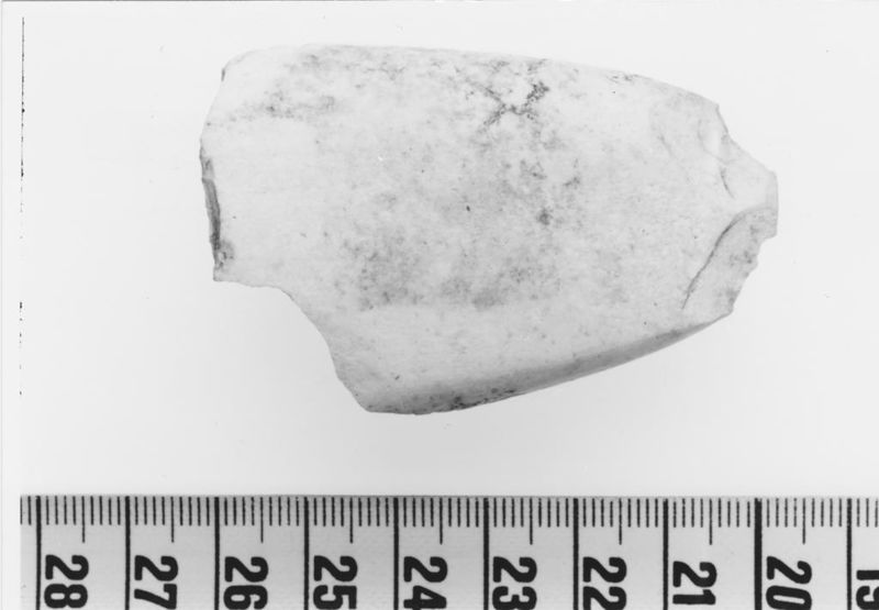 Fragment snede gepolijste vuurstenen bijl. Vuistbijlen behoren tot de oudst bekende stenen werktuigen en gaan terug tot het vroegste steentijd. Zij werden gemaakt door splinters van een steen af te slaan waardoor een scherpe rand ontstond. Deze bijlen konden ook worden gebruikt als mes of schraper. Uit de midden steentijd zijn de eerste bijlen bekend die aan stelen werden bevestigd. Hiermee kan een grotere kracht worden uitgeoefend waardoor de gebruiker met een lichtere bijl kan werken en minde Meer ... |