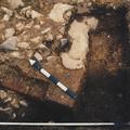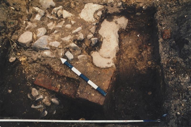 Opgraving kerk Ouddorp. Van het oude maaskeien kerkje is door allerlei begravingen niet veel meer over. Hier zien we nog een deel van de fundering van de oude koormuur, de …..oostelijke afsluiting van het eerste kerkje. |