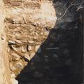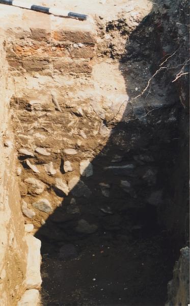 Opgraving kerk Ouddorp. Een doorsnede van de oude koormuur. De muur is geheel opgetrokken uit maaskeien. Alleen bovenop zien we een laag bakstenen die na de uitbreiding van de kerk met het gotisch koor werd aangebracht. |