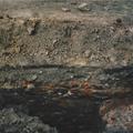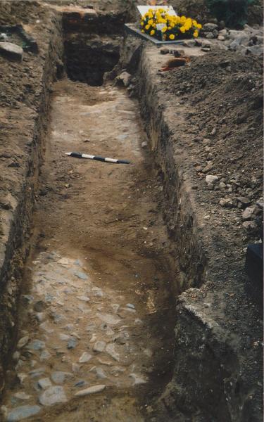 Opgraving kerk Ouddorp. In de proefsleuf 2 vloeren van maaskeien op 60 cm diep. Wellicht het oudste loopvlak van het oorspronkelijke kerkje. |