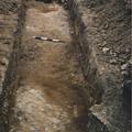Opgraving kerkhof Oud Dorp. De bovenkant van de massieve torenfundering wordt blootgelegd, dicht onder het oppervlak |