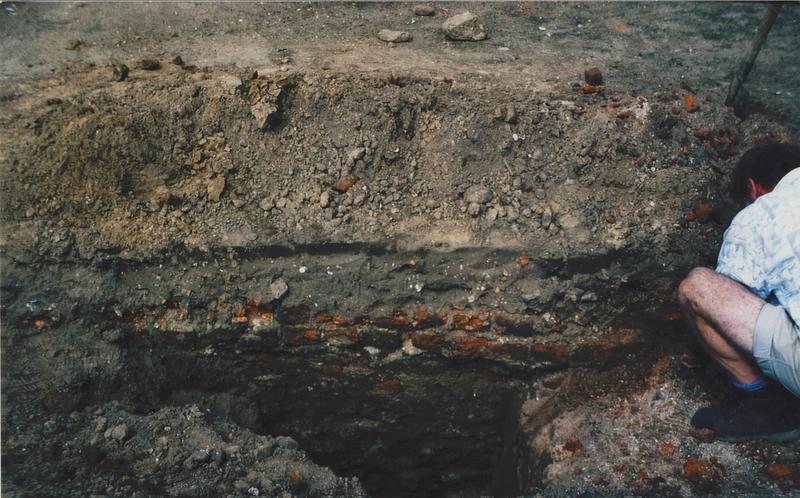 Opgraving kerk Ouddorp. Zijaanzicht van de massieve bakstenen fundering, van meer dan 1.50 mtr diep. |