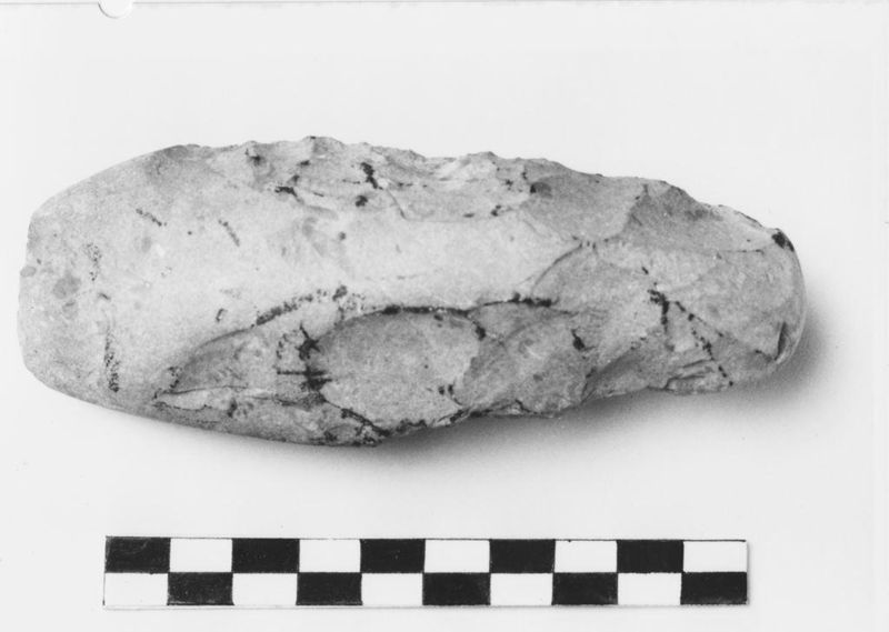 Vuurstenen bijl. Vondstnummer 64/15. Vuistbijlen behoren tot de oudst bekende stenen werktuigen en gaan terug tot het vroegste steentijd. Zij werden gemaakt door splinters van een steen af te slaan waardoor een scherpe rand ontstond. Deze bijlen konden ook worden gebruikt als mes of schraper. Uit de midden steentijd zijn de eerste bijlen bekend die aan stelen werden bevestigd. Hiermee kan een grotere kracht worden uitgeoefend waardoor de gebruiker met een lichtere bijl kan werken en minder snel Meer ... |