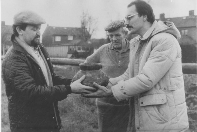 Archeologie | Vader en zoon Simons overhandigen bronstijd urn. | Beesel | 1-12-1991 | 1991 | ||||