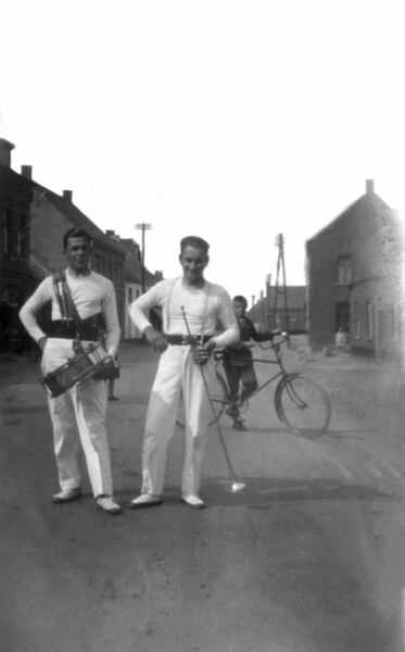Leden van de Gymnastiekvereniging Hercules. "De Rijksweg in Reuver, kijkend richting Belfeld in 1932. Op de voorgrond "Sjoester" Lei Rutten (1904-1961) met trompet." |