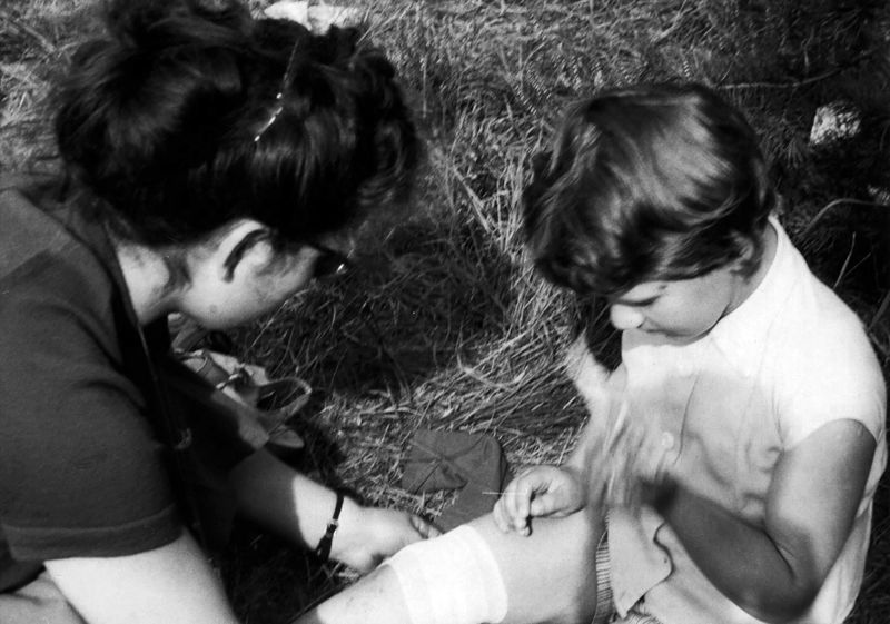 Verenigingen en organisaties | Adri Veldman (links op de foto) verleent eerste hulp tijdens het kindervakantiewerk op 18 augustus 1960 in de Walsberg. | Walsbergweg | Reuver | 18-8-1960 | 1960 | |||