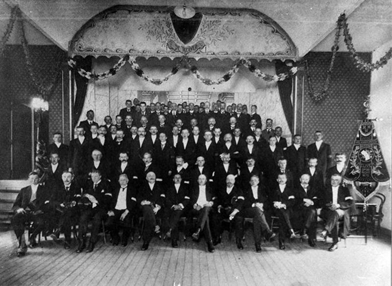 Het Philharmonisch gezelschap ter ere van hun 50- jarig bestaan. De foto is genomen in de harmoniezaal van Piet Peeters. Voorop zit het feestcomité. Op de eerste rij zitten: Heldens, Peter van Eyk, Anthonie Hulsman, Jean Goossens (mede oprichter van de Philharmonie in begin 1870), Lambert van der Velden, Piet Thijssen, Willem Meuter (dat jaar tot burgemeester benoemd), Jac Laumans sr. , Frans Heldens, Anton Thijssen, Louis Wolfs en Jos Janssen. De vaandeldrager is Mobers. Het bestuur staat in d Meer ... |