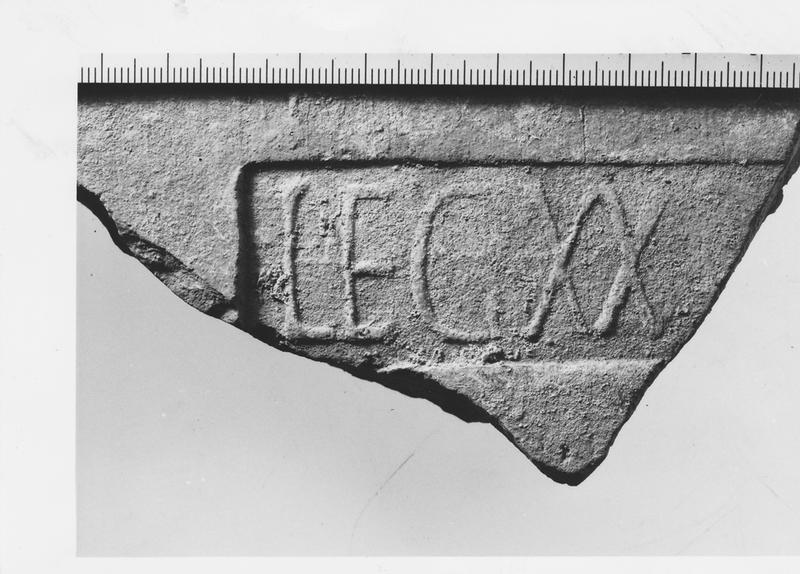 Archeologie | Dakpan met Romeinse stempel LEGXXX(VV); gevonden op de Krekelbergsheide | Patersweg | Belfeld | 2-3de eeuw | ||||