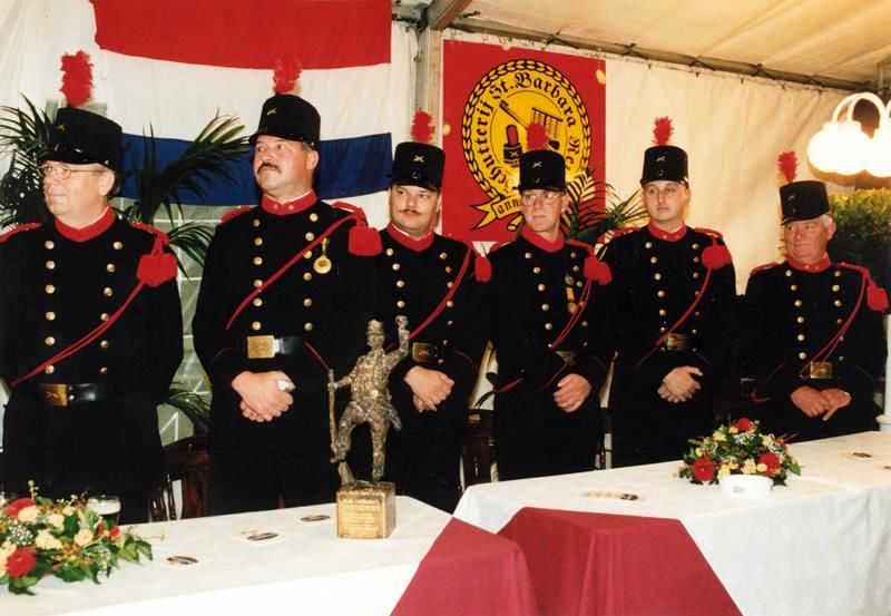 Het zes-tal van schutterij Sint Barbara tijdens het OLS in Reuver. Dit was het winnende zestal in 1998. Van links naar rechts: 1 NN.... 6 NN Heeft u namen geef deze dan even door via de reageerknop. |