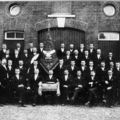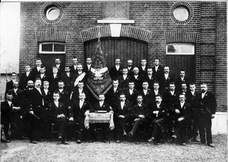 De oudste foto van Reuvers Mannenkoor. Waarschijnlijk gemaakt t.g.v. het nieuwe vaandel in de zomer van 1904. Zittend: Sjang Niesen, dan staande Jean Lichtenberg (dirigent), Willem Janssen, Bér Teunissen, Sjeng Niemans, Hein Willemsen, Chris van der Velden, Hubert Bors, Sjang Houwers. 1e rij: Herman Willems, Cornelis Vossen, Hendrik....., Rein Rovers, Fried Houwers, Sjra Goossens, Ties Levels, Kueb Geyzen, Handrie Litjens, Frans Heinen, N.N., Naed Niemans, Wout van der Avoort. 2e rij Meer ... |