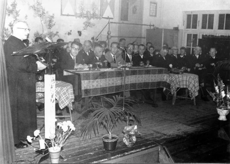 Verenigingen en organisaties | Harmonie St. Gertrudis. T.g.v. het behalen van de 1e prijs door de Harmonie werd het gezelschap door de bevolking gehuldigd. Pastoor de Winter tijdens zijn toespraak. | Markt | Beesel | |||||