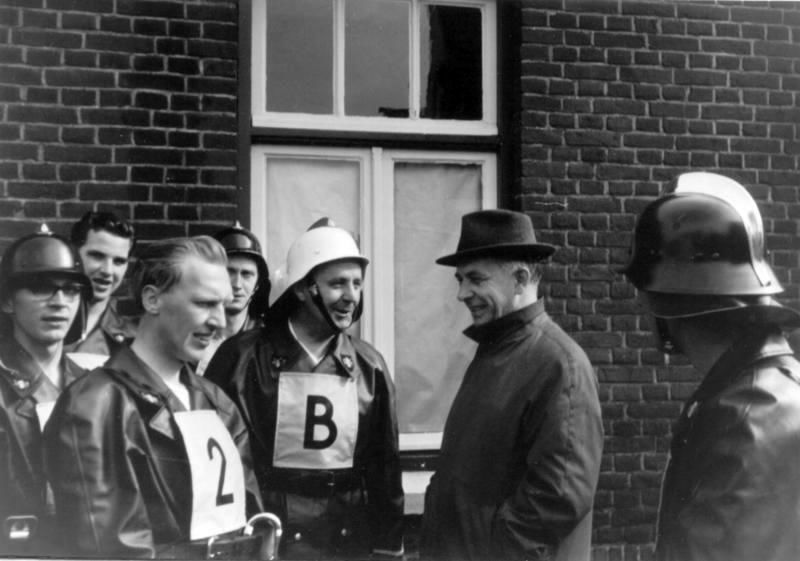 Vrijwillige brandweer. Brandweer oude wagen. 1: Lex Nelissen 2: J. v. Neer 3: J. Heinen 4: Frans Wijnands 5: Theike Smets 6: Jan v. de Heuvel 7: Dre Fleuren 8: Cor Wijnands 9: Piet Heldens 10: Frans Peeters |