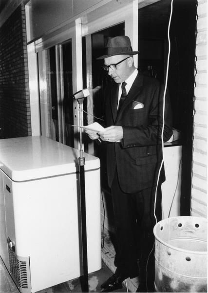 Sport & Recreatie | Zwembad De Bercken: de opening - wethouder Peeters houdt de openingsrede. | Bösdaellaan 1 | Reuver | 29-6-1966 | 1966 | |||
