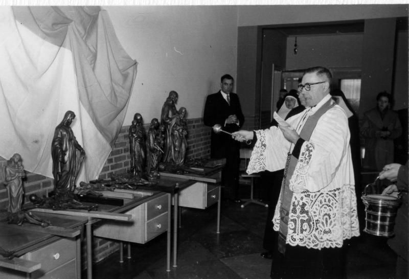 Landbouwhuishoudschool gebouwd in 1950. Mater Amabilisschool geopend in 1954 door de heer Houben, commissaris van Koningin in Limburg. De inzegening is geschied door pastoor Ceyssens. Rechts burgemeester Claessen. |
