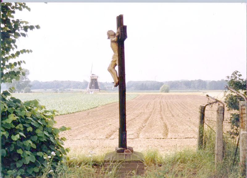 Molens | Windmolen "De Grauwe Beer" te Beesel met op voorgrond veldkruis van opzij gezien. | St. Antoniusstraat | Beesel | |||||