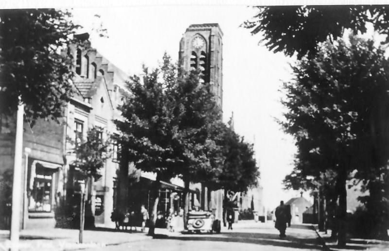 Kerk en religie | Past. Vranckenlaan met de Sint Lamberuskerk (zonder toren) en links Goossens drogisterij. | Pastoor Vranckenlaan 4 | Reuver | 1945 | ||||