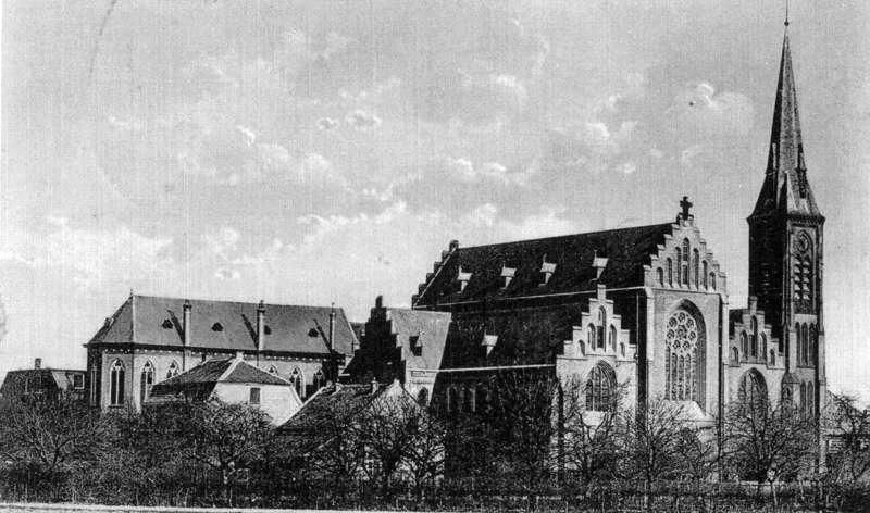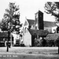 Sint Lambertuskerk gezien vanaf oostkant spoorlijn Links de overweg aan de Rijksweg. |