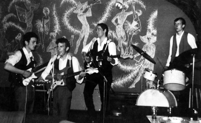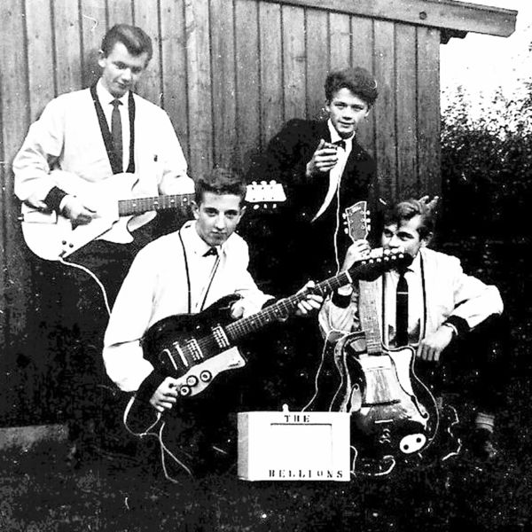 Orkesten uit de jaren zestig van de twintigste eeuw. The Hellions. Het zijn staand links Frits Achten, staand rechts John Derks, hurkend links John Gubbels en rechts hurkend Jack Linssen. |