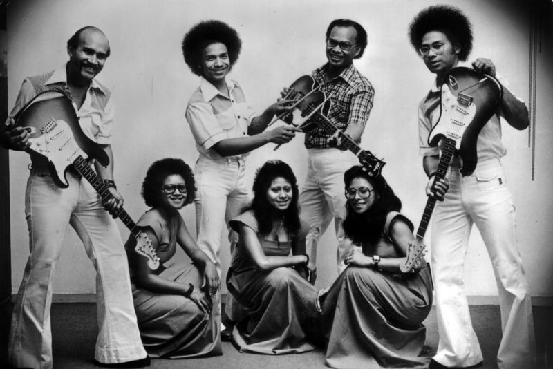Orkesten uit de jaren zestig van de twintigste eeuw. The R-Sarwev Brothers (familie Renwarin) met van links naar rechts: hurkend 1 Claire Renwarin, 2 NN, 3 NN, Staande : 1 NN, 2, 3, 4 |