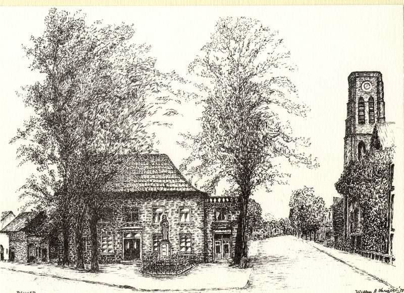 Gemeentehuis / Gemeentebestuur | Raadhuis en kerk te Reuver ca 1950 (pentekening). Gemaakt in 1979 t.g.v. de opening van de Amro-bank aan de Past. Vranckenlaan 40 te Reuver. | Rijksweg 41 | Reuver | 1950 | ||||