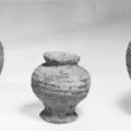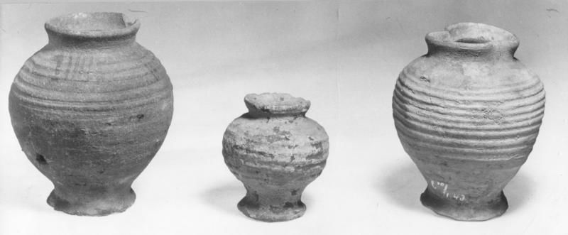 Opgravingen aan de Prinsendijk in Reuver: 1. Pot met golfvoet, vroeg middeleeuws; h 15 cm. 2. 2. Klein geribd potje met gegolfd voetje h 9 cm, bodem 5 cm. 3. Geribd kannetje met golfvoet; h 15 cm. Aangekocht van de heer J.W. Ueberbach te Helden. Coll. Rijksmuseum voor Oudheden. |