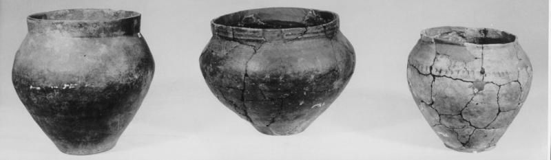 Archeologie | IJzertijd vondsten Beesel: l 1910/3.4; l 1915/1.3; l 1910/3.28. Van links naar rechts: 1. Waarschijnlijk laat-Germaans urntje; versierd met nagelindrukken, erg gebarsten en beschadigd; opgegraven op het land van de heer Hensen te Beesel. 2. Kleine urn van bulten voorzien; h 15,9 cm. Aangekocht van dhr. Hensen te Beesel. 3. Germaanse urn; h 14,1 cm; opgegraven op het land van de heer Hensen te Beesel. | Beeselseweg | Beesel | |||||
