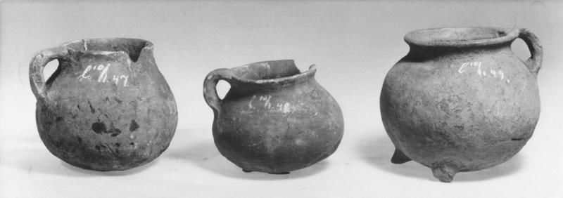 Opgravingen aan de Prinsendijk in Reuver: Van links naar rechts: 1. Kogelpotje met oor; h 10,5 cm; aangekocht van dhr. J.W. Ueberbach te Helden. 2. Vroeg-middeleeuws kogelpotje met oor; h 8 cm; aangekocht van dhr. J.W. Ueberbach te Helden. 3. Vroeg-middeleeuws kogelpotje met oor en pootjes; aangekocht van dhr. J.W. Ueberbach te Helden. Coll. Rijksmuseum voor Oudheden. |