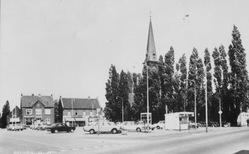 Wegen | De markt in Reuver met op de achtergrond de kerk en winkels aan de Pastoor Vranckenlaan en op de voorgrond de friteskraam. | Raadhuisplein | Reuver | 1970 | ||||