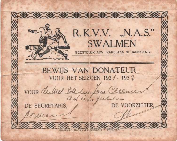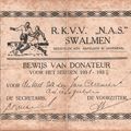 Documenten | Een bewijs van donatie aan de amateurvoetbalclub N.A.S. (Na Afloop Sterk) uit Swalmen. | Swalmen | 1931 | |||||
