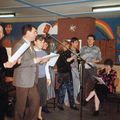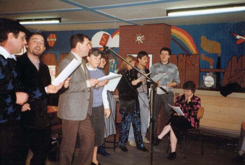 Repetitie voor de "Kleisjtaeker-revue" vlnr : Piet Hillekens, Jo Niesen, Wiel Weijers, Annie Nissen-van der Velden, Diny Rovers-Crommentuijn, Claartje Muisers-Feijen, Pieter Janssen, Eric van Dijk, Riky Hillekens-Litjens (soufleuse) |