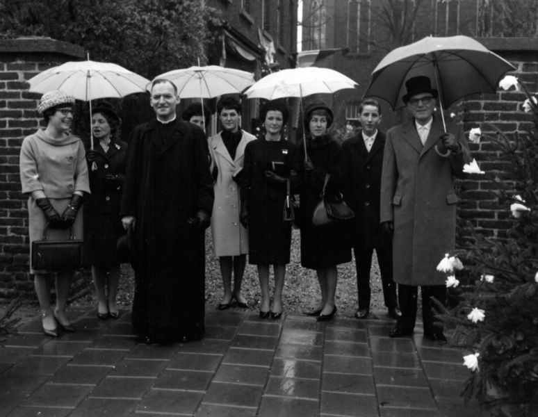 Kerk en religie | Pastoor van de Broek omringd door zijn familie voor de ingang van de Pastorie tijdens zijn 25-jarig priesterfeest in 1963 | Karel Doormanlaan 4 | Reuver | 1963 | ||||