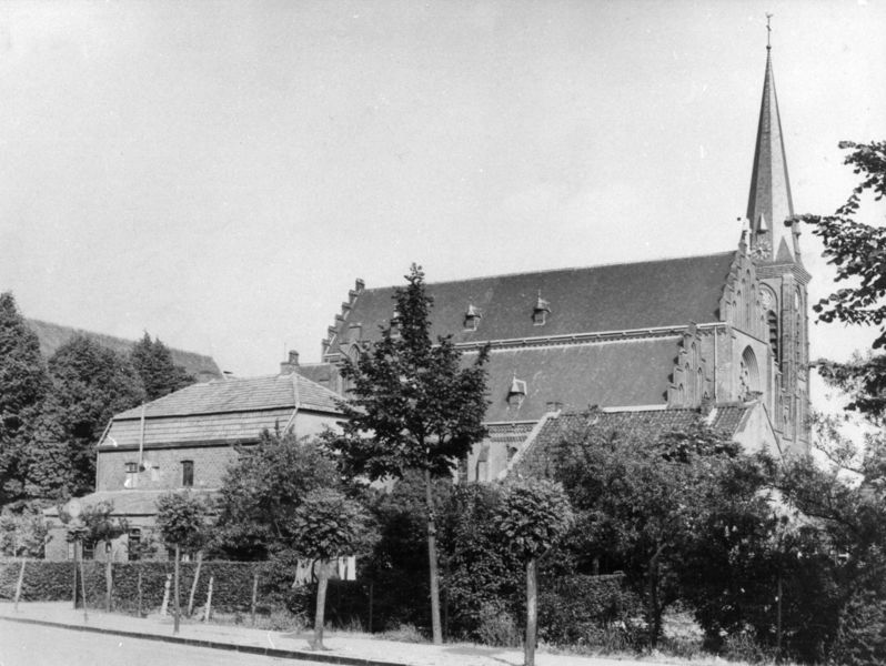 De Sint Lambertuskerk van Reuver gezien vanaf die Karel Doormanlaan. Links op de voorgrond zie we de oude pastorie, rechts de oude kapelanie (beide zijn in 1963 afgebroken). (foto was eigendom van mevr. Fleuren) |
