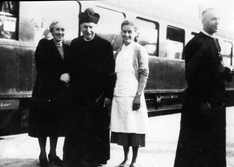 Bidden, zingen, praten over alles wat in het leven tegenzit. De nachttrein, die al sinds 1883 naar bedevaartsoord Lourdes rijdt, is niet zomaar een boemeltje. Al in 1883 - zo'n 25 jaar nadat de Heilige Bernadette in Lourdes haar visioenen kreeg pufte er een pelgrimstrein zuidwaarts. Dat was een particulier initiatief van mensen die al eens met een bedevaart vanuit België waren meegegaan en zoiets ook in Nederland wilden. Op de foto zien we in het midden Mgr. Lemmens en rechts naast hem mej. A Meer ... |