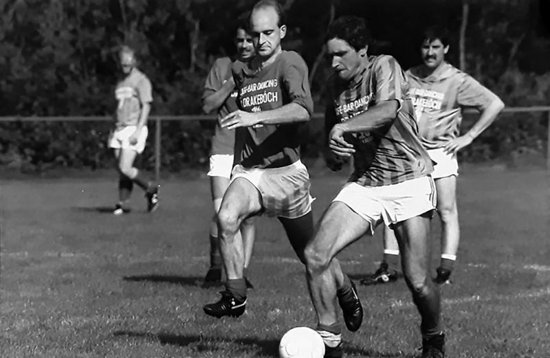 Voetbalvereniging V.V. Bieslo Een actiefoto tijdens een vriendschappelijke wedstrijd tussen Bieslo 1 en oud Bieslo 1 in 1977 Links op de voorgrond NN, rechts Frans Gommans ? |