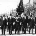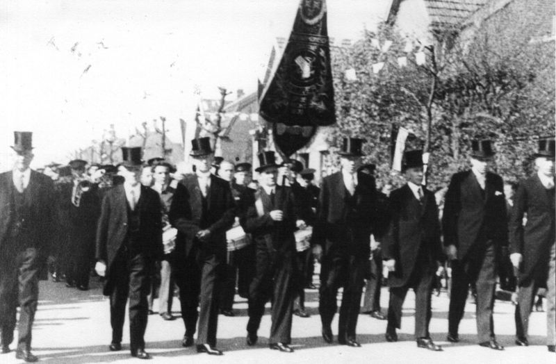 Leden van het Philharmonisch gezelschap uit Reuver bij de optocht naar de kerk tergelegenheid van de eerste heilige mis van Frans Rutten van links naar rechts Peter Janssen, Laurens Pollen, Hendrik Rutten, Hein Rovers, Sjraar Willemsen, Sjaak Rutten, Piet Huibers. De jongen links is Jan Rutten. |