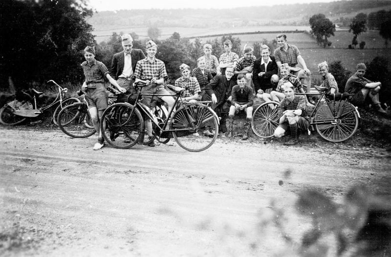 Groepsfoto van de studentenvereniging tijdens een uitstapje met de fiets in 1939. Van links naar rechts: vooraan links: 1 Jo Thijssen, 2 Mathieu Vossen, 3 Willie Vroemen rechts voor de fiets zitend: Frans Rutten rechts vooraan zittend: 1 Mathieu Caris (met muts), 2 Fen Janssen, 3 Emile Strous, 4 Jan Blomen, 5 Huub Teunissen, 6 Mathieu Teeuwen , 7 Herm Thijssen Achterste rij: 1 Harrie Rijnders, 2 Frans Vroemen, 3 Pierre Crooymans, 4 Wim Ermers, 5 Jacques Vroemen. |