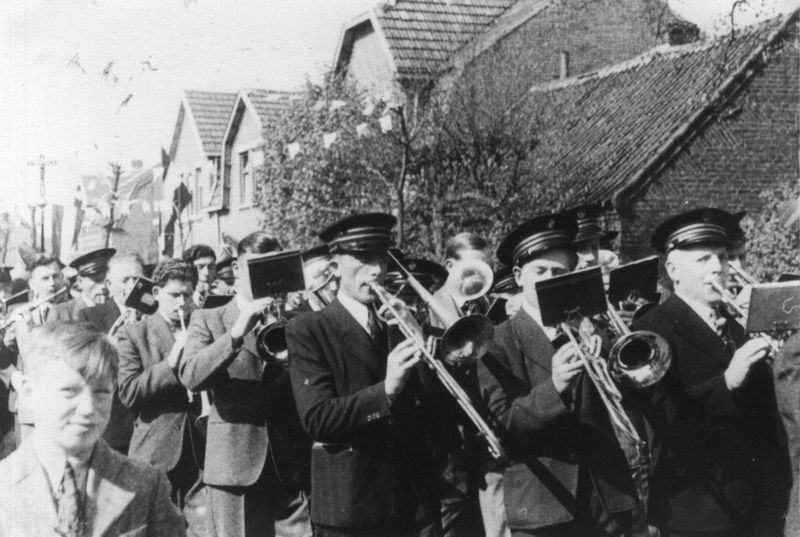 Leden van het Philharmonisch gezelschap tijdens de optocht ter gelegenheid van de eerste heilige mis van Frans Rutten. Van links naar rechts: Stinges, 2 Martien Willemsen, 3 Herm Ledant, 4 Chris Houwers, 5 Frits Houwers. |